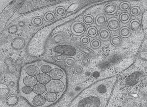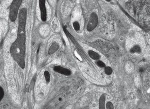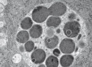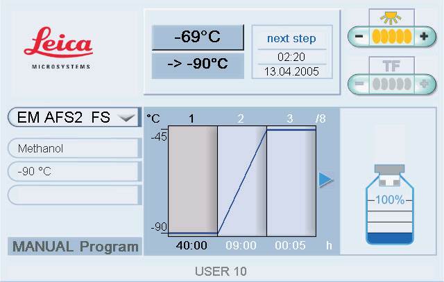 점진적 온도 하강 (PLT)은 화학적으로 고정된 시편의 치환 및 수지 침투를 허용합니다.  마지막으로 샘플은 EM AFS2에서 자외선 하에서 중합되며 절단 및 면역 표지가 가능합니다.