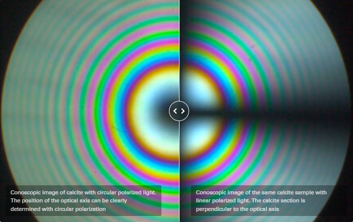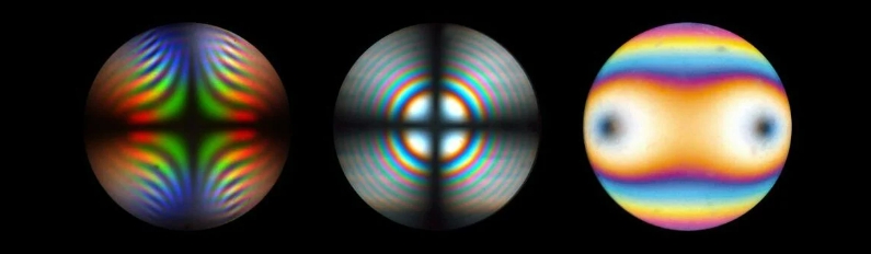 간섭상의 모양과 보정기에 의한 변형은 관찰한 재료의 광학적 특성에 관한 정보를 제공합니다. 재료의 광축 수, 광축 각도 및 광학적 특성을 파악할 수 있습니다.